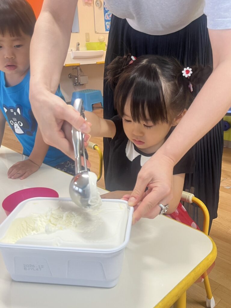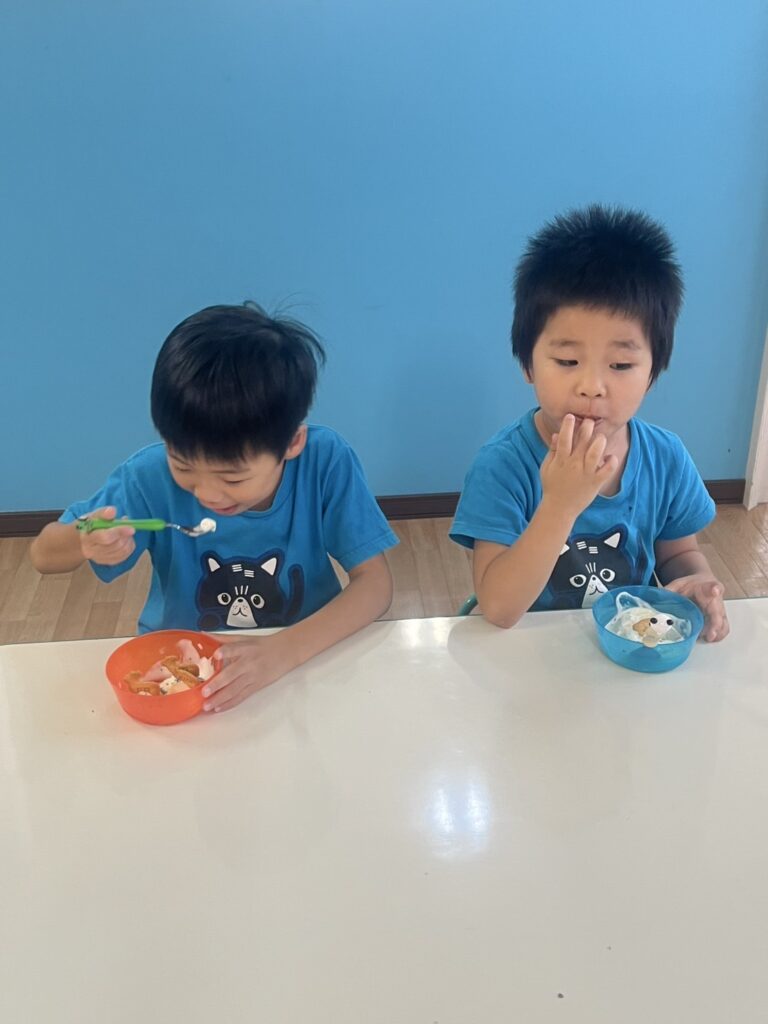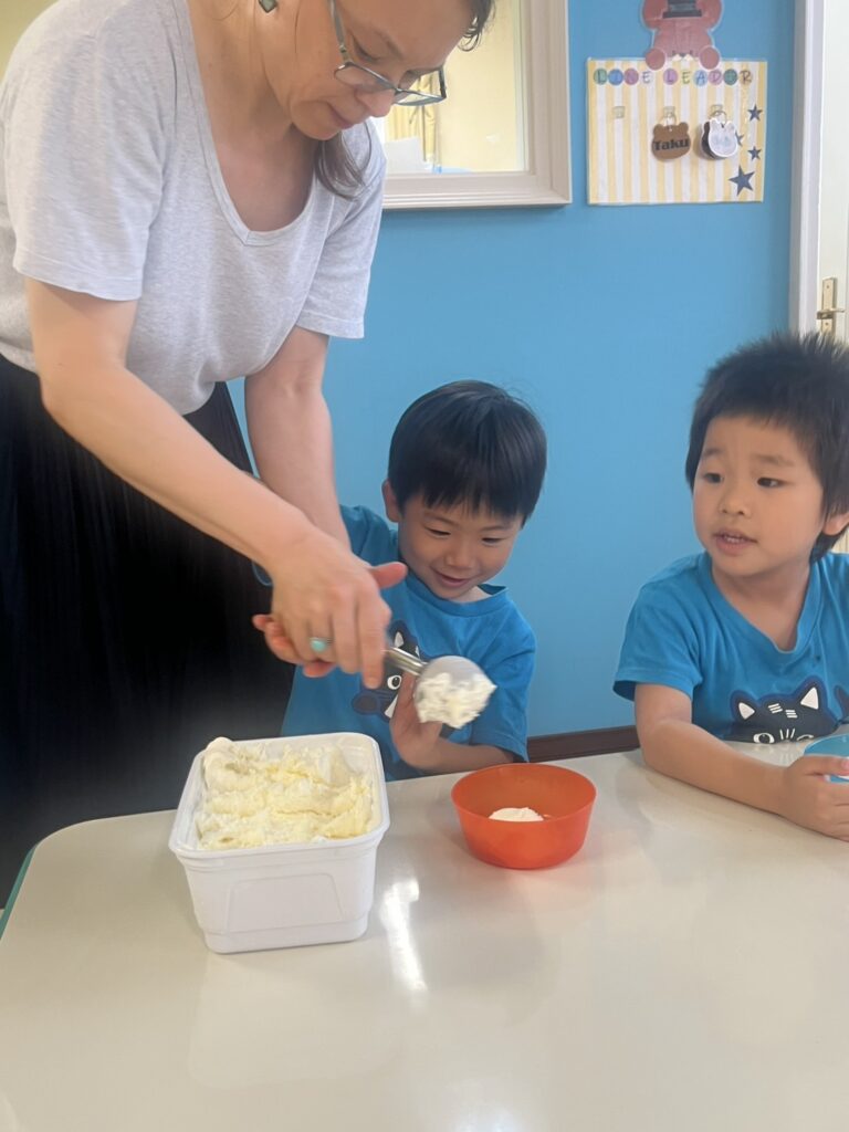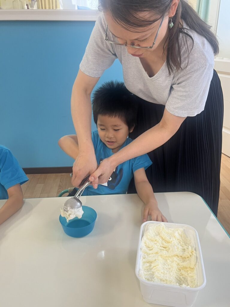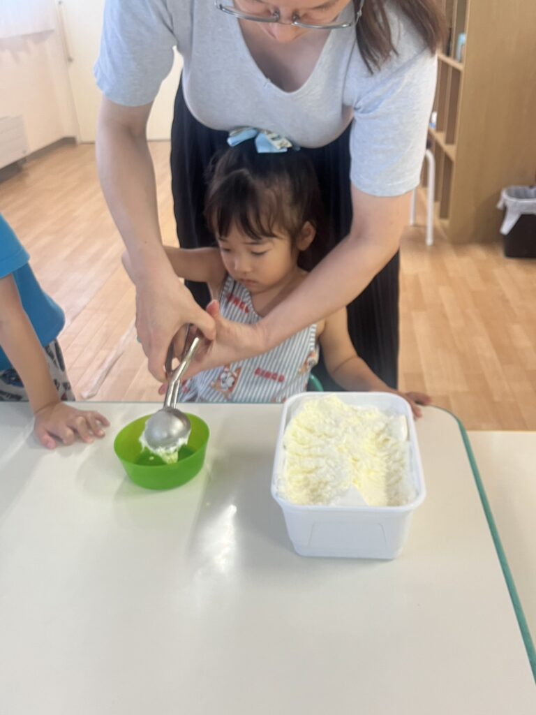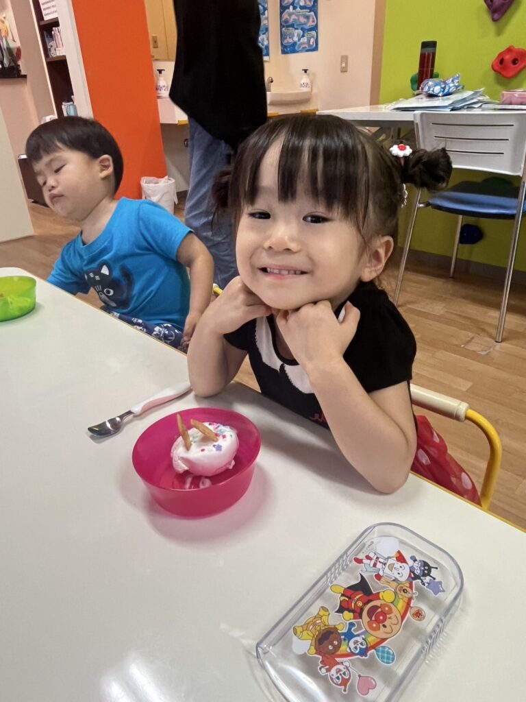 The birthday snack was a “Self-scoop” ice cream sundae, topped with cute animal biscuits and colorful sprinkles. We had the student try to scoop their own giant vanilla ice cream ball, showing them how to drop it in the bowl, and they had a blast.