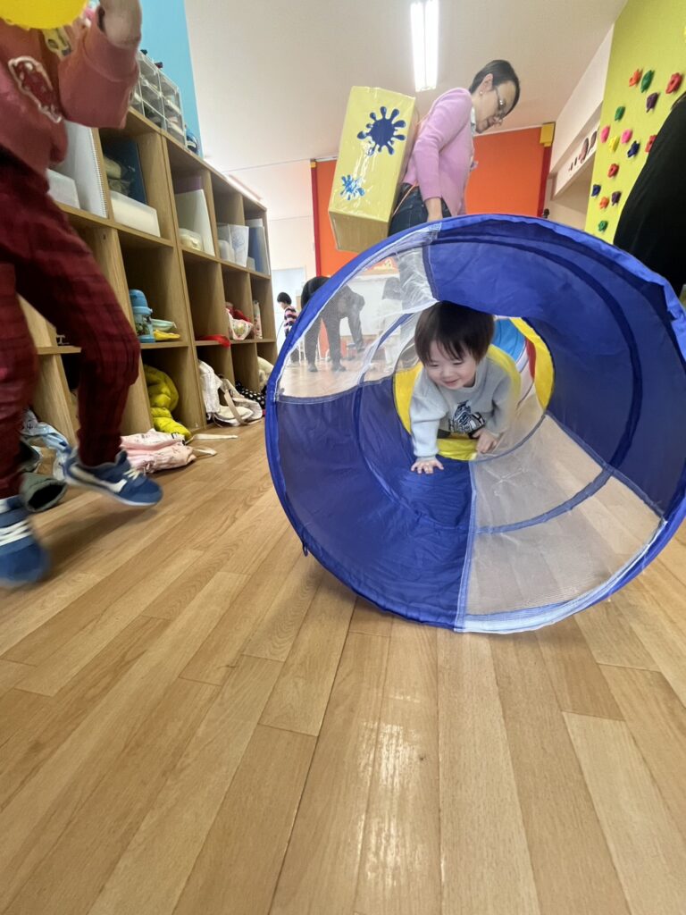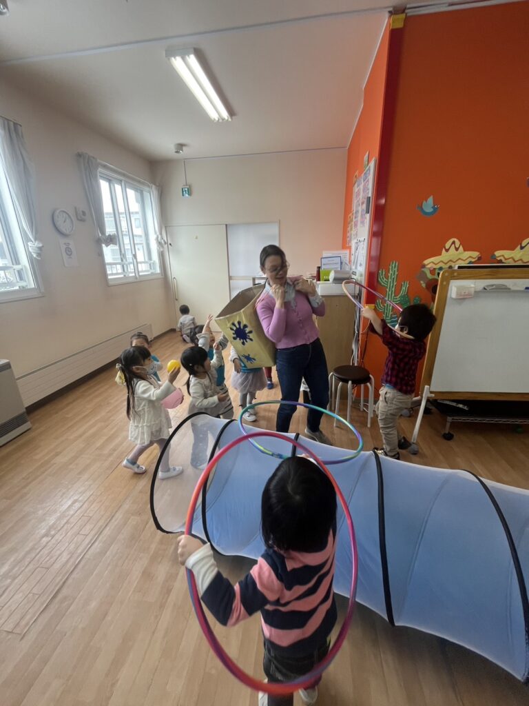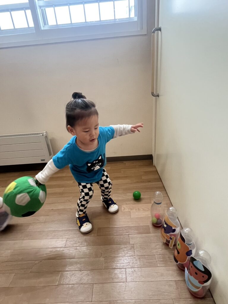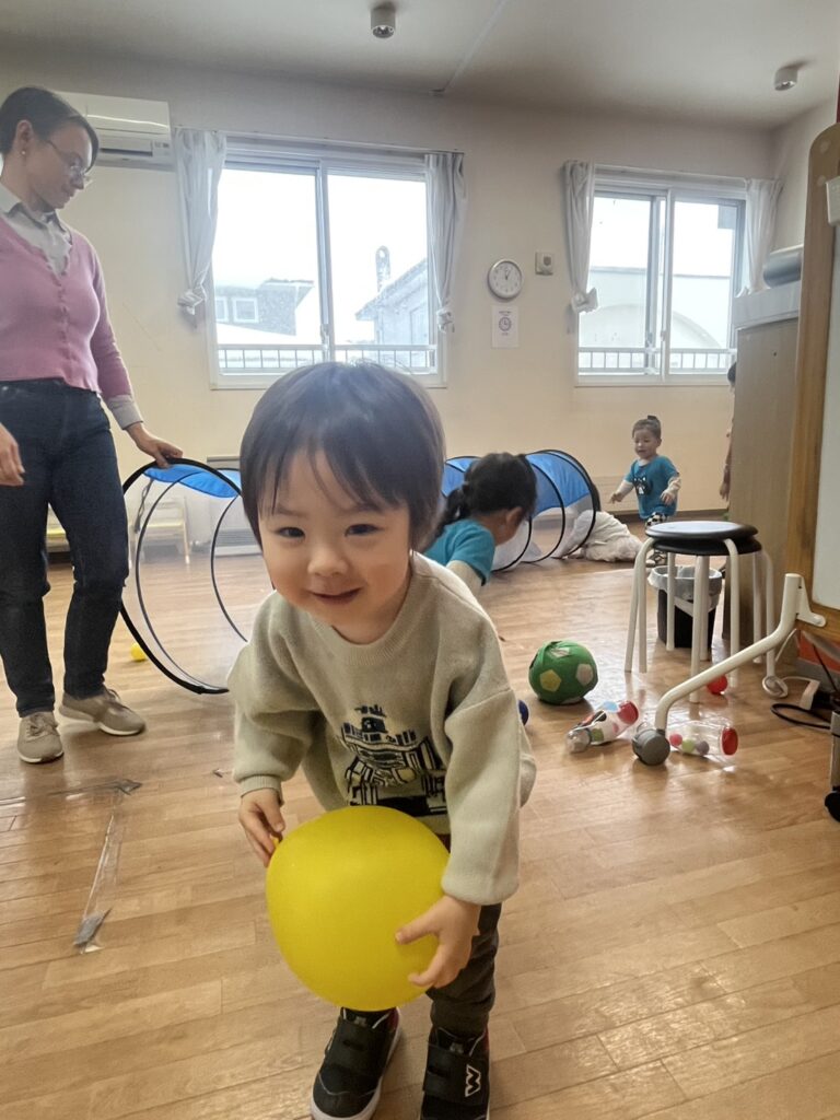 We had a few stations ready: hula hoops, tunnels, balls, and even bowling! Plus some balloons for good measure.