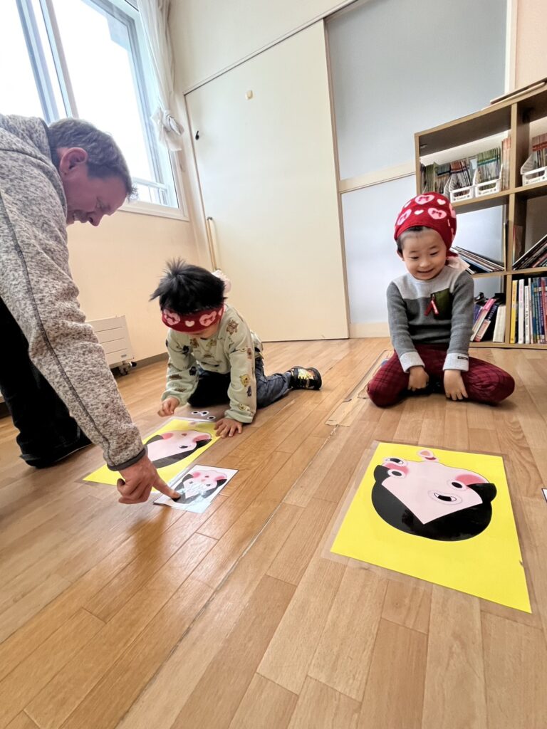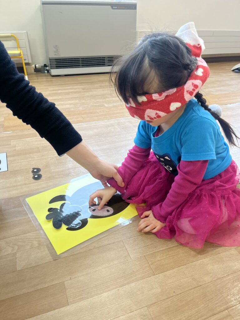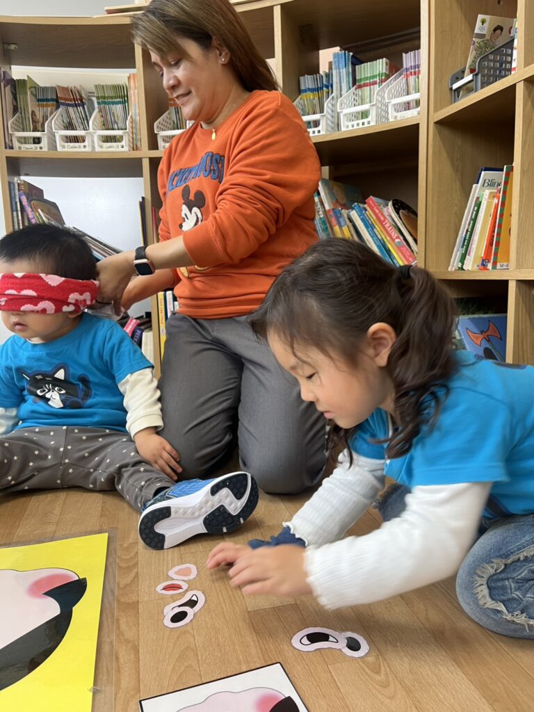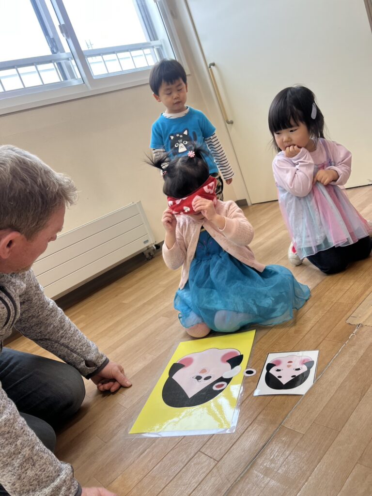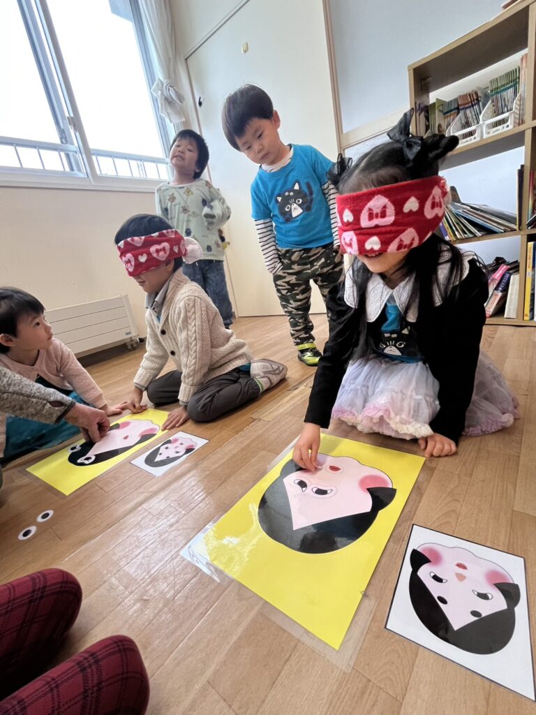 Next, we jumped into the next activity, where the students, blindfolded, had to try to recreate the face of two characters by placing their hair, nose, and eyes in the right place. Needless to say, it was a super fun game with lots of funny creations!!