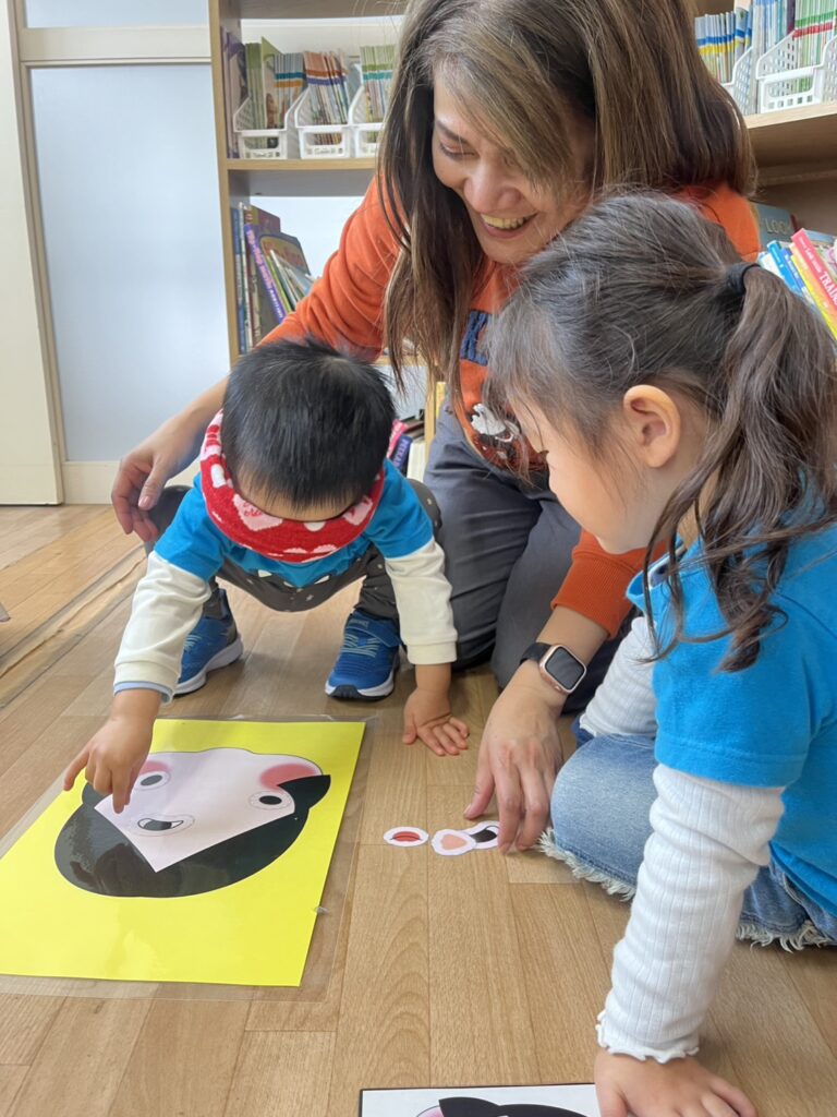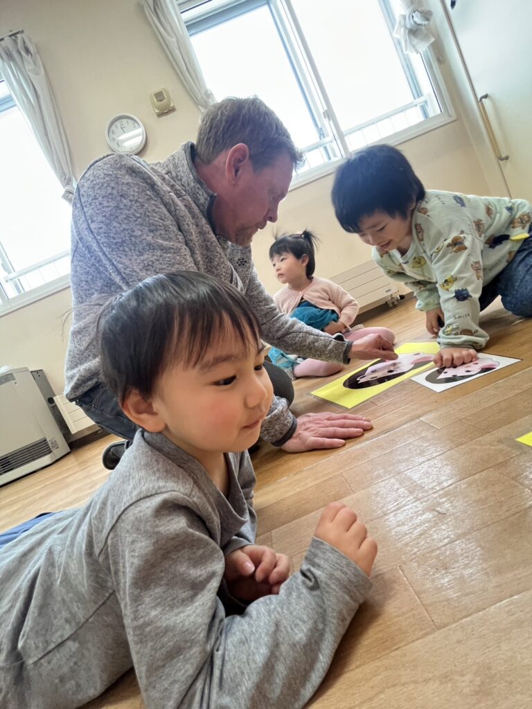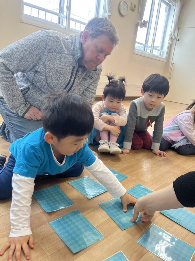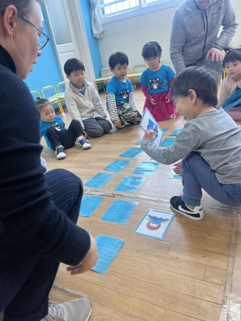 First, we played a “card memory game, where the kids, in groups, chose two cards and tried to find the same cute picture and win points for their teams. The kids were great at remembering!